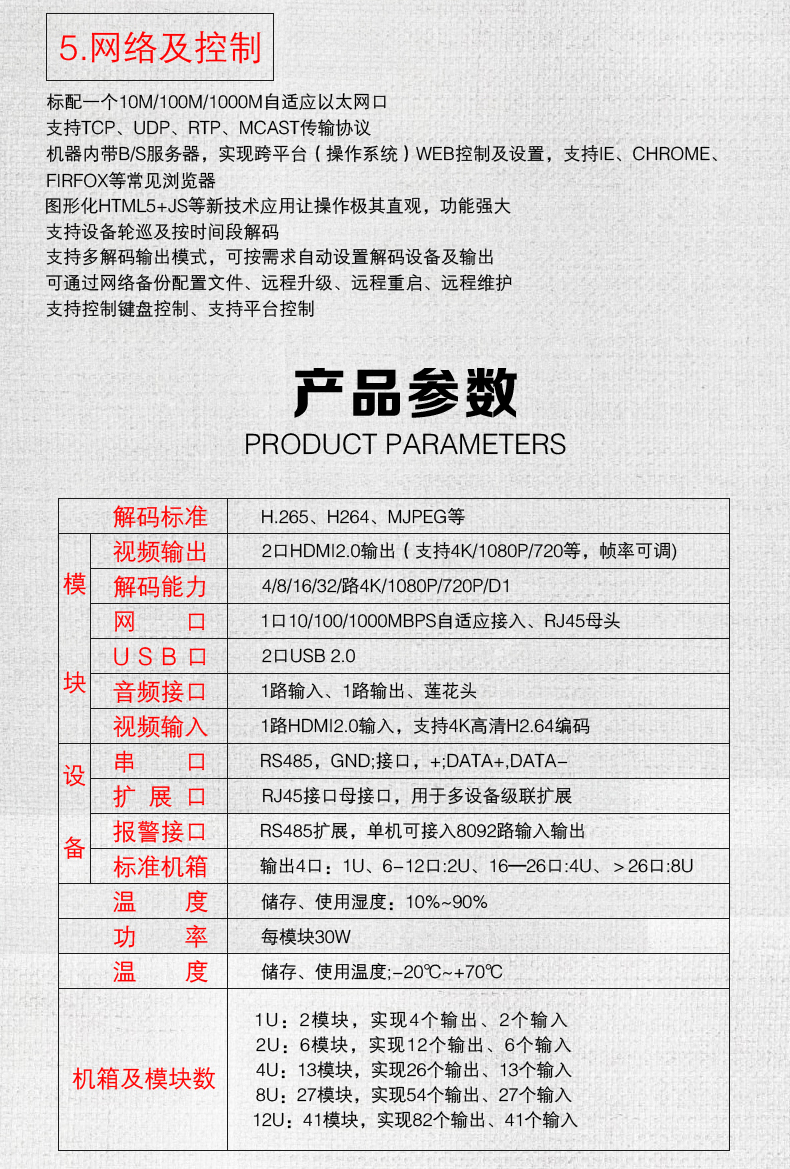 路數:2屏,4屏,6屏,8屏,10屏,12屏,16屏,18屏,20屏,22屏,24屏,26屏,28屏,32屏,36路輸出網絡數字解碼矩陣切換器采用最新的安防專用編解碼芯片,解碼、編碼、拼接、分割、畫中畫、漫游等功能,為工程項目最大程序解決大數據數字化監控系統提供解碼上墻及多信號輸入編碼等提供一站式解決方案;設備采用全鋁標準機箱,結構上大氣美觀可靠,散熱性結構化好